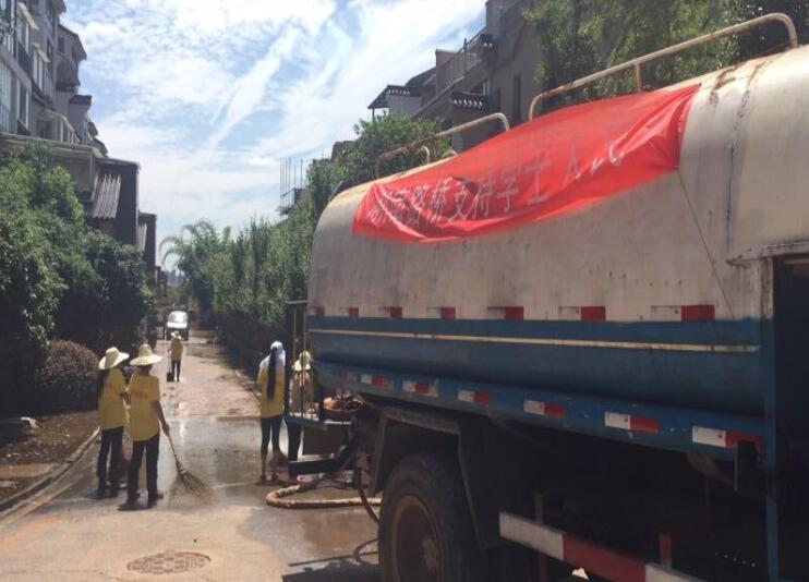 7月6日,烈日當(dāng)空,酷熱難耐,湘江長(zhǎng)沙段剛退出警戒水位,一支由湖南路橋通泰公司長(zhǎng)韶婁東延項(xiàng)目組成的支援災(zāi)后重建隊(duì)伍正在對(duì)含浦片區(qū)內(nèi)的汀湘十里、江山帝景等小區(qū)進(jìn)行地面沖洗、清淤、消毒等工作。
