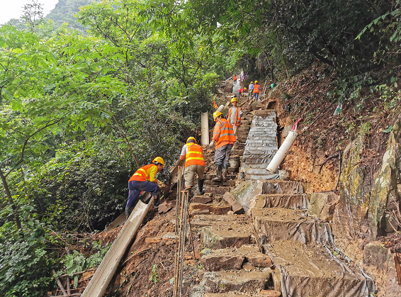 可即便施工環(huán)境如此艱苦,他們也未曾對施工質(zhì)量放松一絲一毫的要求。剛進場時,有一次工人們在梯道施工到后半夜,才完成了當(dāng)天三十余米的施工任務(wù)。但沒想到,第二天一早工人到現(xiàn)場,才發(fā)現(xiàn)因天黑看不清楚,昨夜修好的梯道不夠美觀,于是他們二話不說,將梯道拆了重新施工,達到要求才罷休。